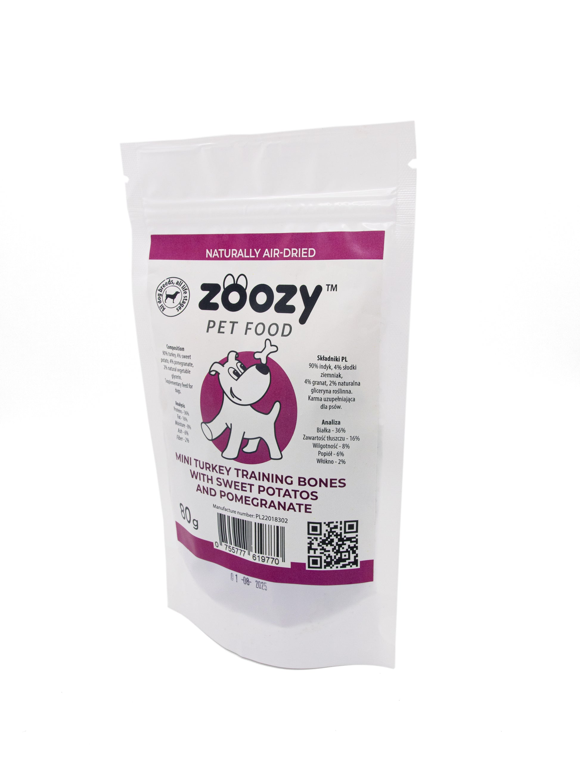Skład: 90% indyka, 4% słodkiego ziemniaka, 4% granatu, 2% naturalnej gliceryny roślinnej. Karma uzupełniająca dla psów.