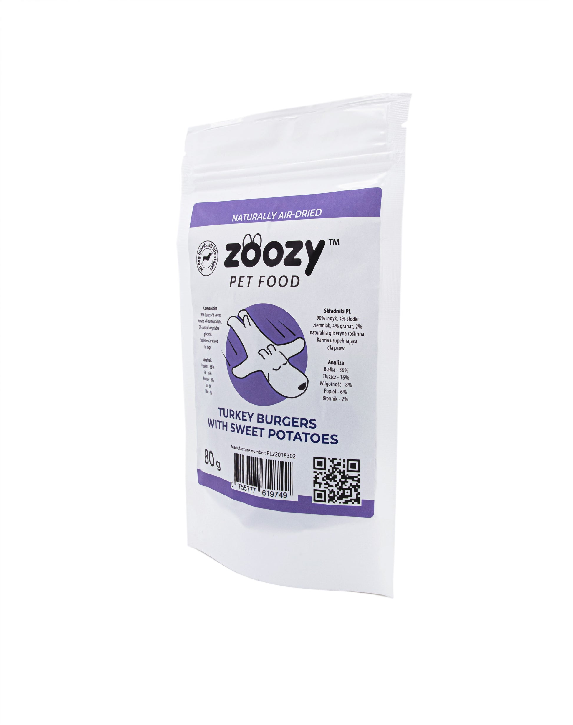 Skład: 90% indyka, 4% słodkich ziemniaków, 4% granatu, 2% naturalnej gliceryny roślinnej. Karma uzupełniająca dla psów.